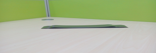 反光熱貼的卷曲對于連續熱燙操作(例如燙帶)不會有影響,但對于切條后剪成一段一段在裁片上燙制的操作會存在定位不準的問題。但是一個正確的且良好的后期成品使用習慣會降低對成品卷曲程度的要求,裁片燙制操作中操作習慣導致的卷曲程度的差異對比如下。