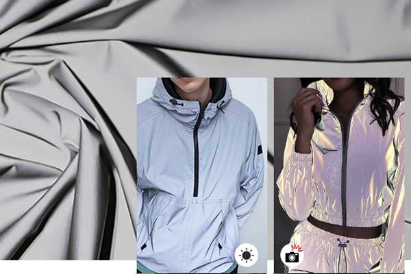 而隨著工藝技術的不斷創新,星華反光布的反光效果已不再是最初單一的銀灰色反光形式,七彩反光、印花反光、漸變雙色反光、彩色反光、夜光反光等多種新型反光布料應運而生。這些五彩繽紛的面料更加適合于在日常服飾、箱包、鞋帽設計上使用。無論是作為服裝的大身面料,還是作為鞋帽的包邊,或者是室內的背景布,反光面料都能讓原本平淡的設計增添更多的色彩變幻,打破常規,與眾不同。